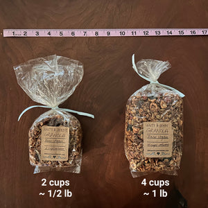 Our fill our bags by volume since weight can vary from batch to batch. We recommend like to eat 1/2 cup of granola with milk/mylk as a serving size for a quick breakfast.