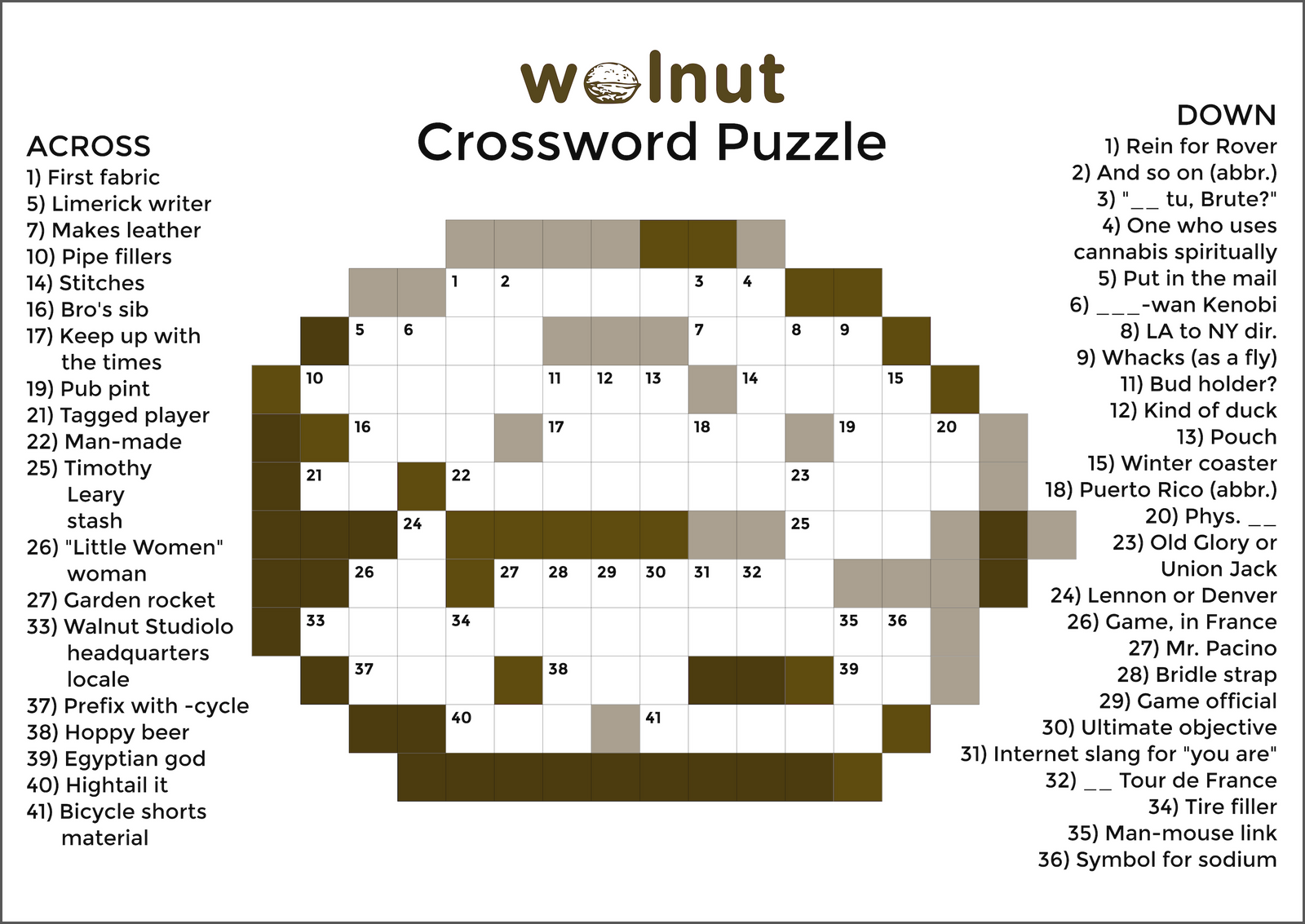 Solve 41 clues to fill in our own handcrafted, house-made crossword puzzle with a Walnut Studiolo theme in a walnut shape.