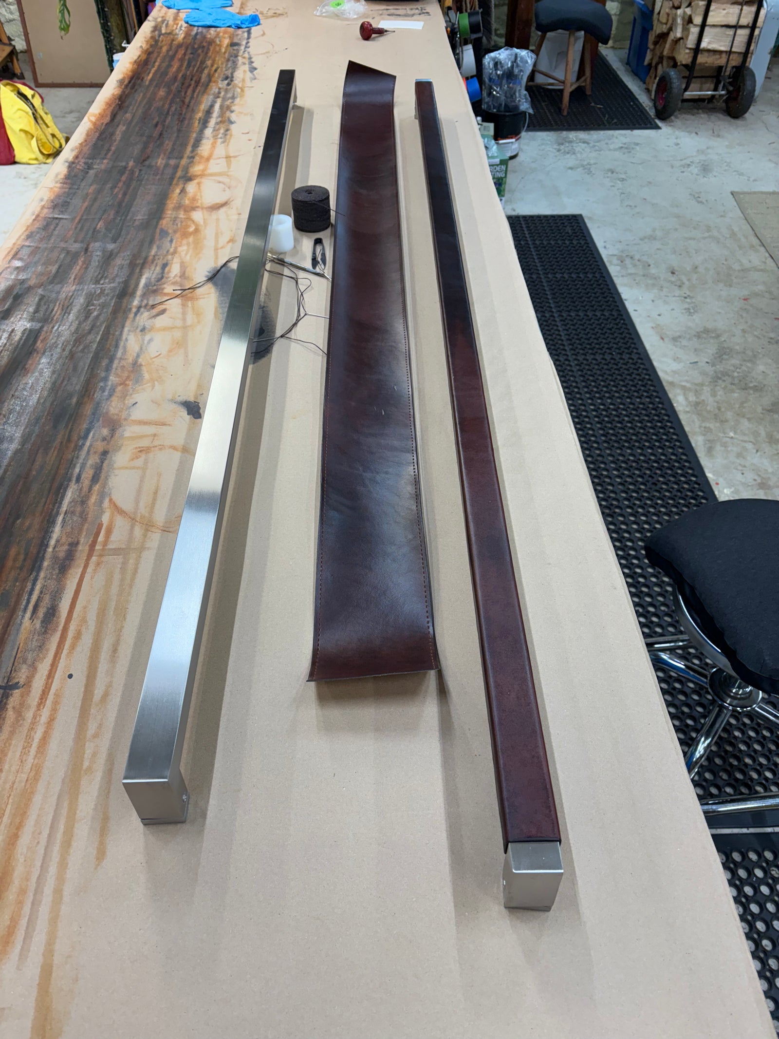 Ces poignées de porte extérieures commerciales standard ont été envoyées à notre atelier par le client. Nous y avons fabriqué et cousu à la main un revêtement en cuir brun foncé sur mesure de 183 cm de long.
