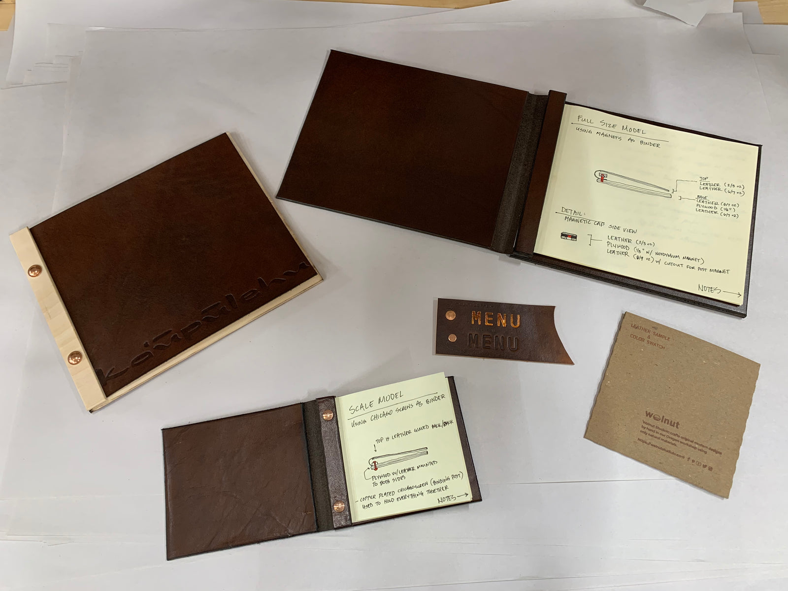 Nous avons créé un livre de menus en cuir de haute qualité, fabriqué à la main, pour la carte des vins de la cave d'un restaurant, avec des innovations permettant des changements de menu fréquents.