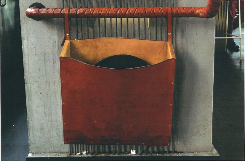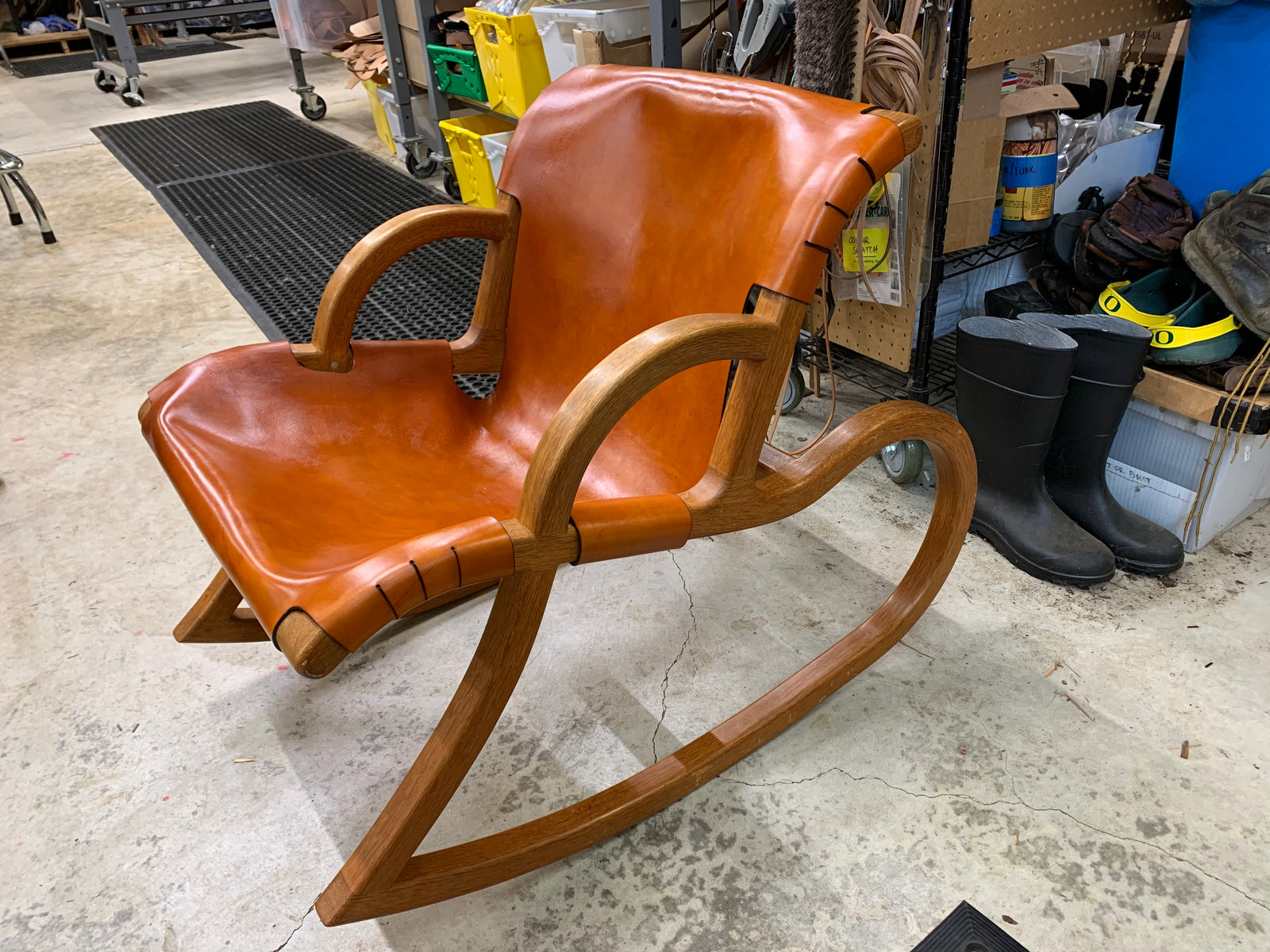 Nous avons fabriqué et installé un panneau de cuir de remplacement pour une chaise berçante en élingue d'héritage dans une couleur miel teinte à la main.
