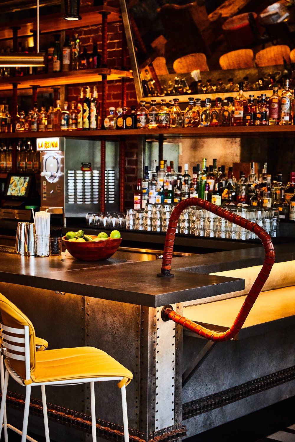 Nous avons conçu et fabriqué un support de plateau à boissons personnalisé en cuir et en bois pour aller avec les détails de l'habillage du bar en cuir de ce restaurant.