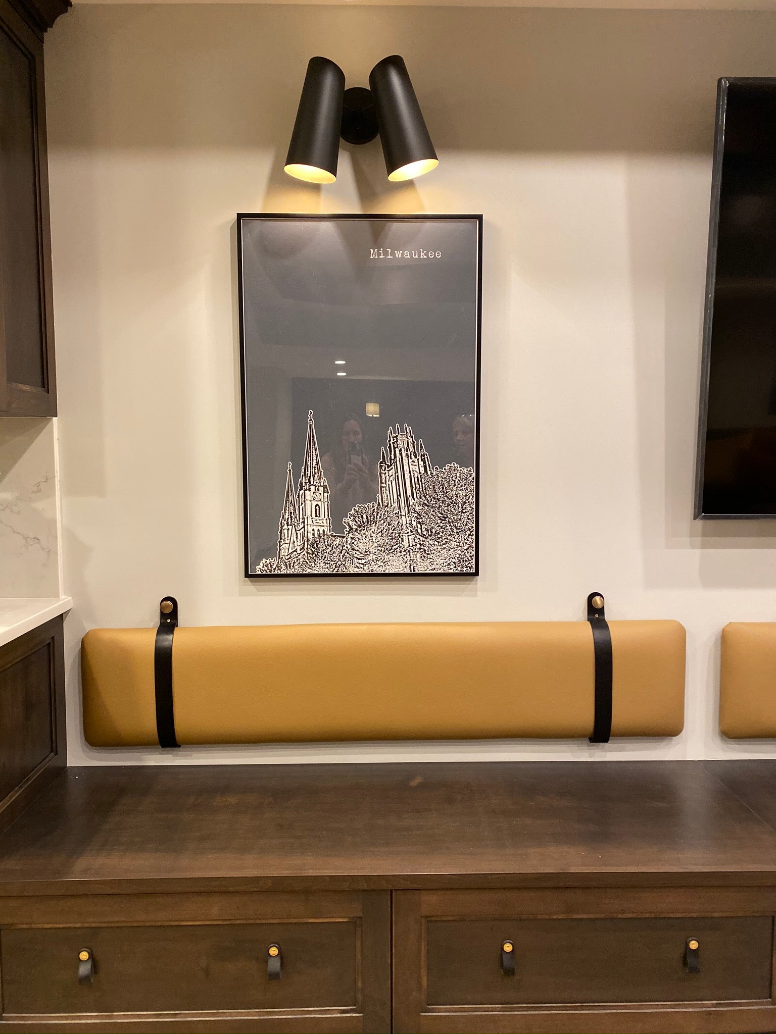 Semblable à notre conception de poignée Hawthorne, nous avons créé des boucles en cuir extra-larges et robustes comme sangles de coussin de banc dans le cadre d'une rénovation de salle de jeux résidentielle haut de gamme.
