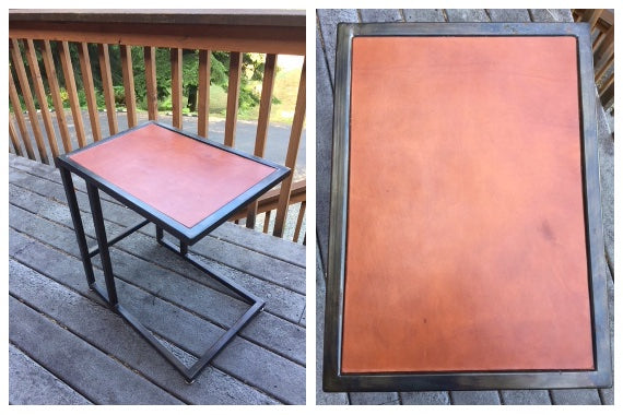 Nous avons créé et installé un élégant revêtement en cuir teint à la main pour un ensemble de tables d'appoint en métal soudé sur mesure. Le cuir prendra une belle patine foncée avec le temps, le toucher et l'usage.