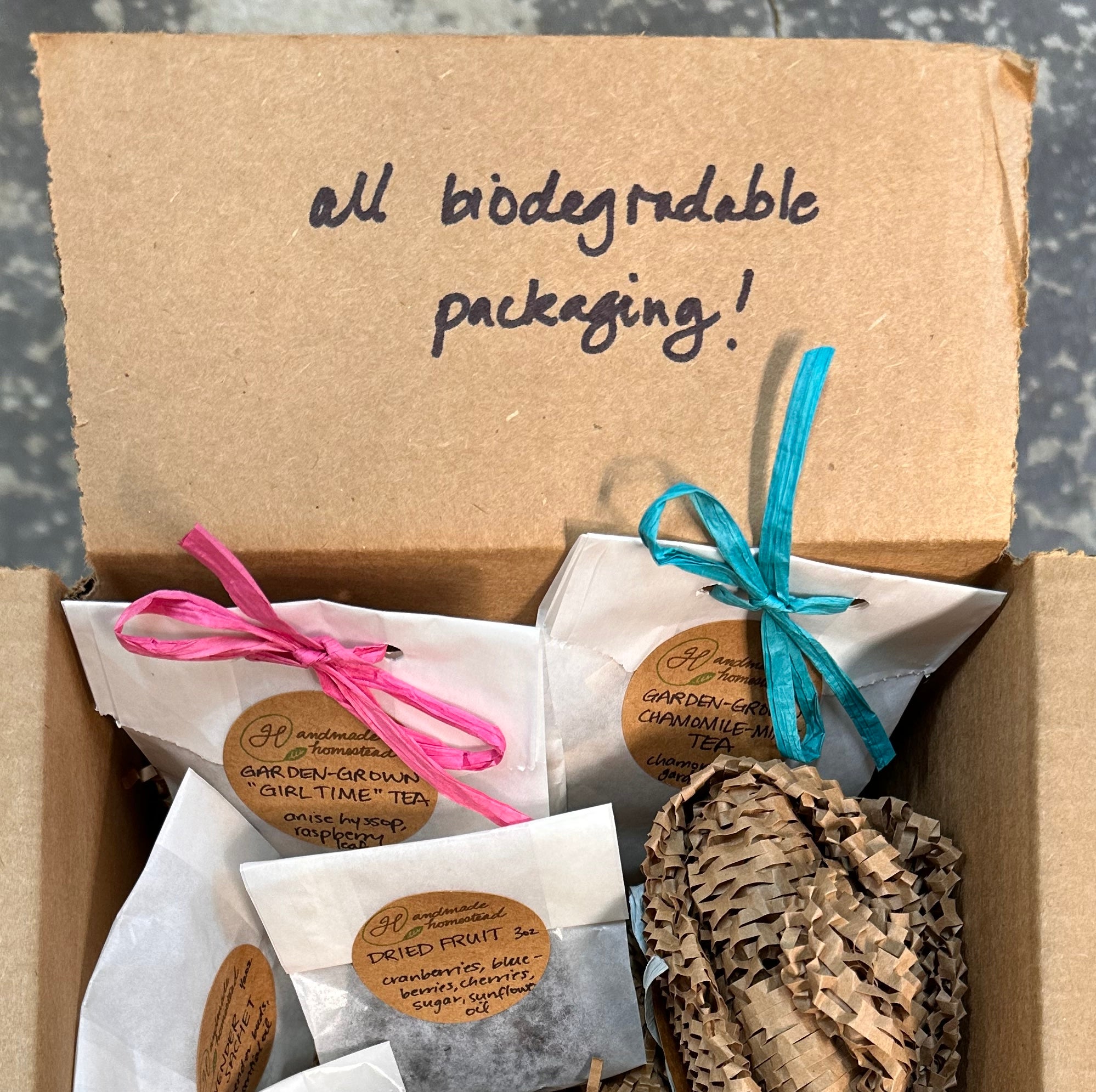 All packaged in 100% biodegradable, compostable, plastic-free packaging.